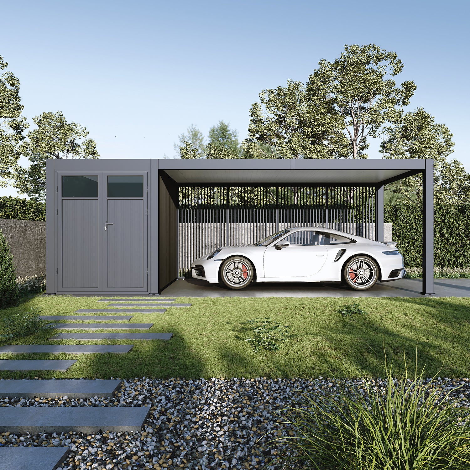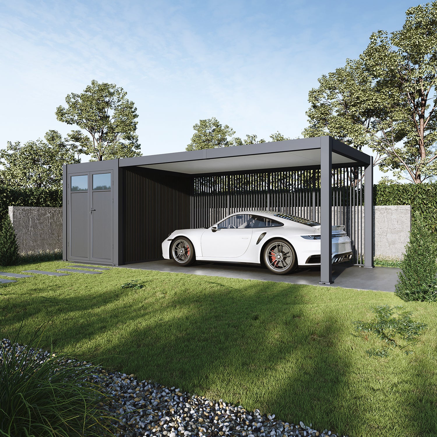 Kyllä, 3 metrin WPC-seinällä tai 3 x 0,93 metrin säleseinällä (vaakasuora, pystysuora tai design).