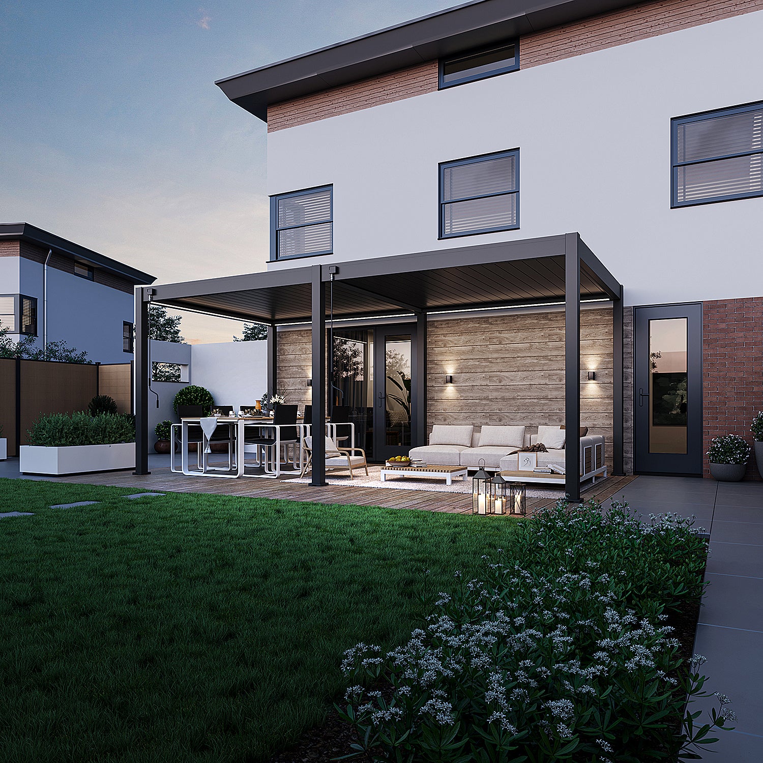 Innovatiivinen sadevesijärjestelmä ohjaa veden hallitusti pois. Vesi valuu kattolammellien kautta poistopalkkeihin joista se johdetaan edelleen pylväiden sisällä, mistä se poistuu alareunan tyhjennysaukkojen kautta. Järjestelmän moitteettoman toiminnan varmistamiseksi vesikourut ja viemärit on hyvä puhdistaa säännöllisesti lehdistä ja liasta. Lisävarusteena saatavilla olevat tuulisuojat ja lamelliseinät tekevät pergolasta entistäkin suojaisamman. Ne estävät tehokkaasti sivusuunnasta tulevan sateen ja tuulen, suojaten pergolan sisätilaa ja parantaen käyttömukavuutta kaikissa olosuhteissa. Näin voit nauttia ulkotilastasi säästä riippumatta – olipa kyseessä kevyt kesäsade tai voimakkaampi tuulinen sää. Tutustu sadeveden hallintaratkaisuihin ja lisävarusteisiin – viimeistele pergolasi täydellisesti suojaamaan sinua kaikilta säiden vaihteluilta!