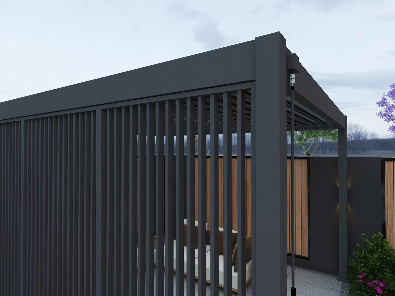 ✔ Viimeistelty ulkonäkö – antrasiitinharmaa sävy (RAL 7024 FS/MATT) antaa pergolallesi modernin ja tyylikkään ilmeen.